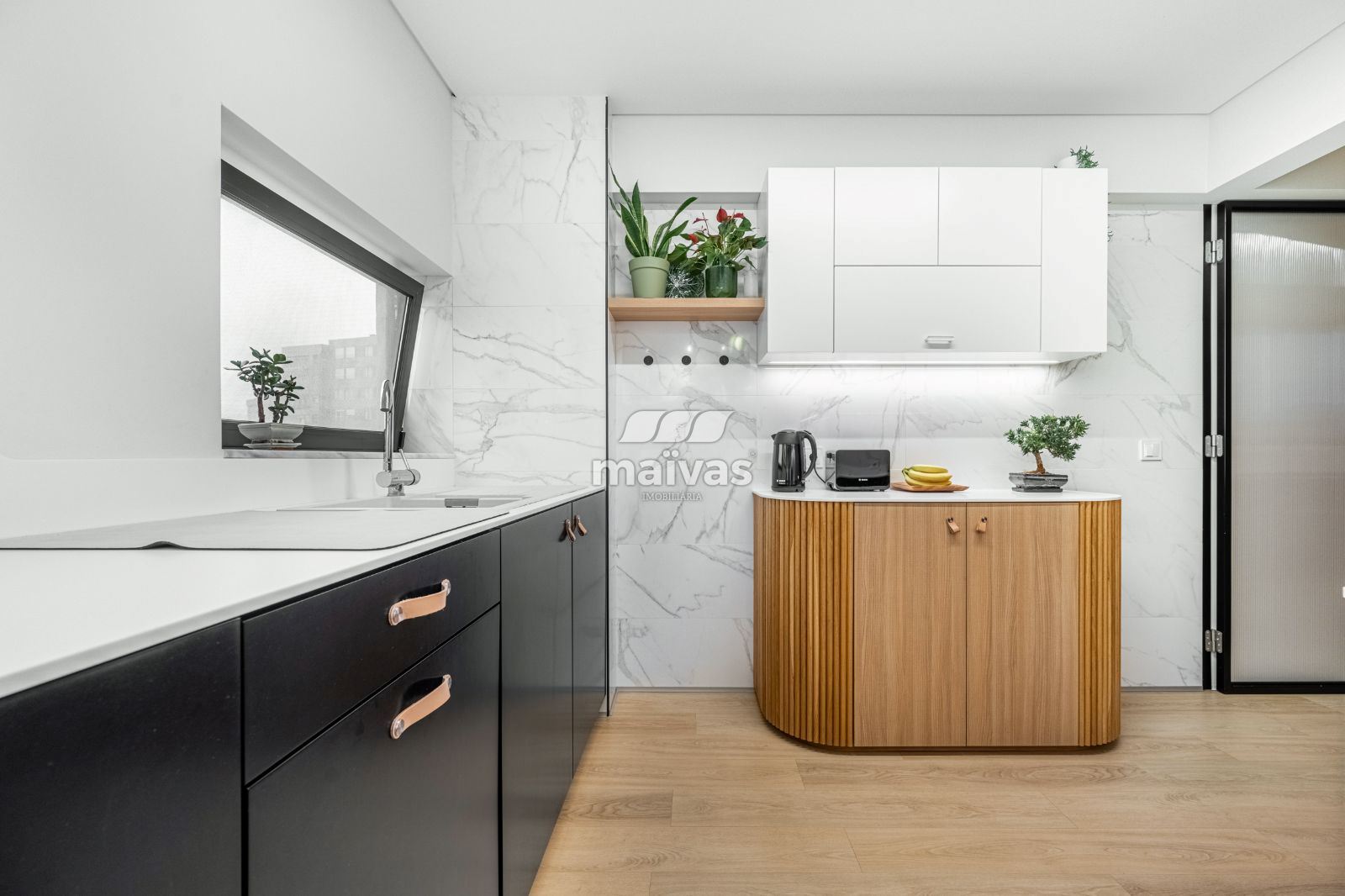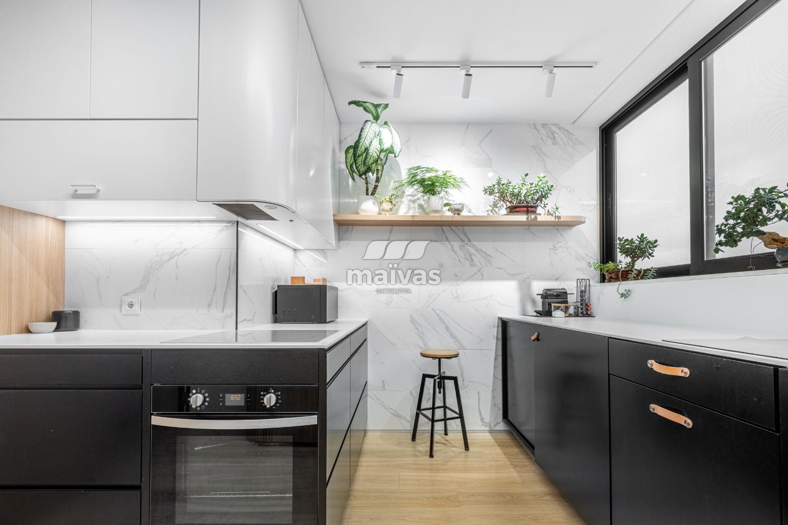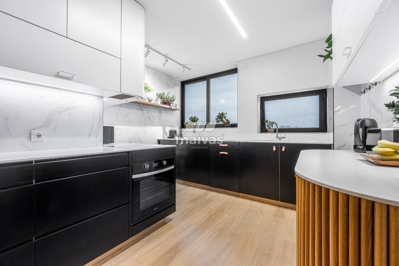 - Acabamentos de elevada qualidade, com móveis superiores lacados a branco e inferiores em Valchromate, balcões em Hi-Macs e banca em quartzo;